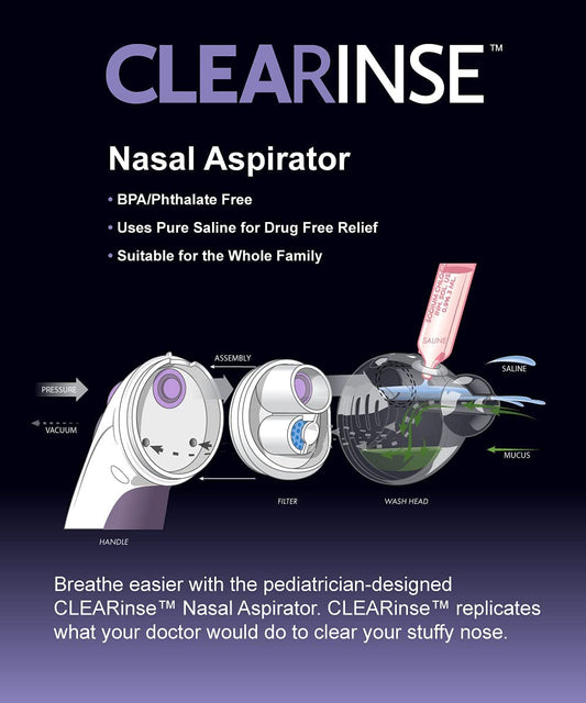 The CLEARinse device provides safe vacuum suction to the nasal cavity to help remove hard blockages after softened by sterile saline solution.